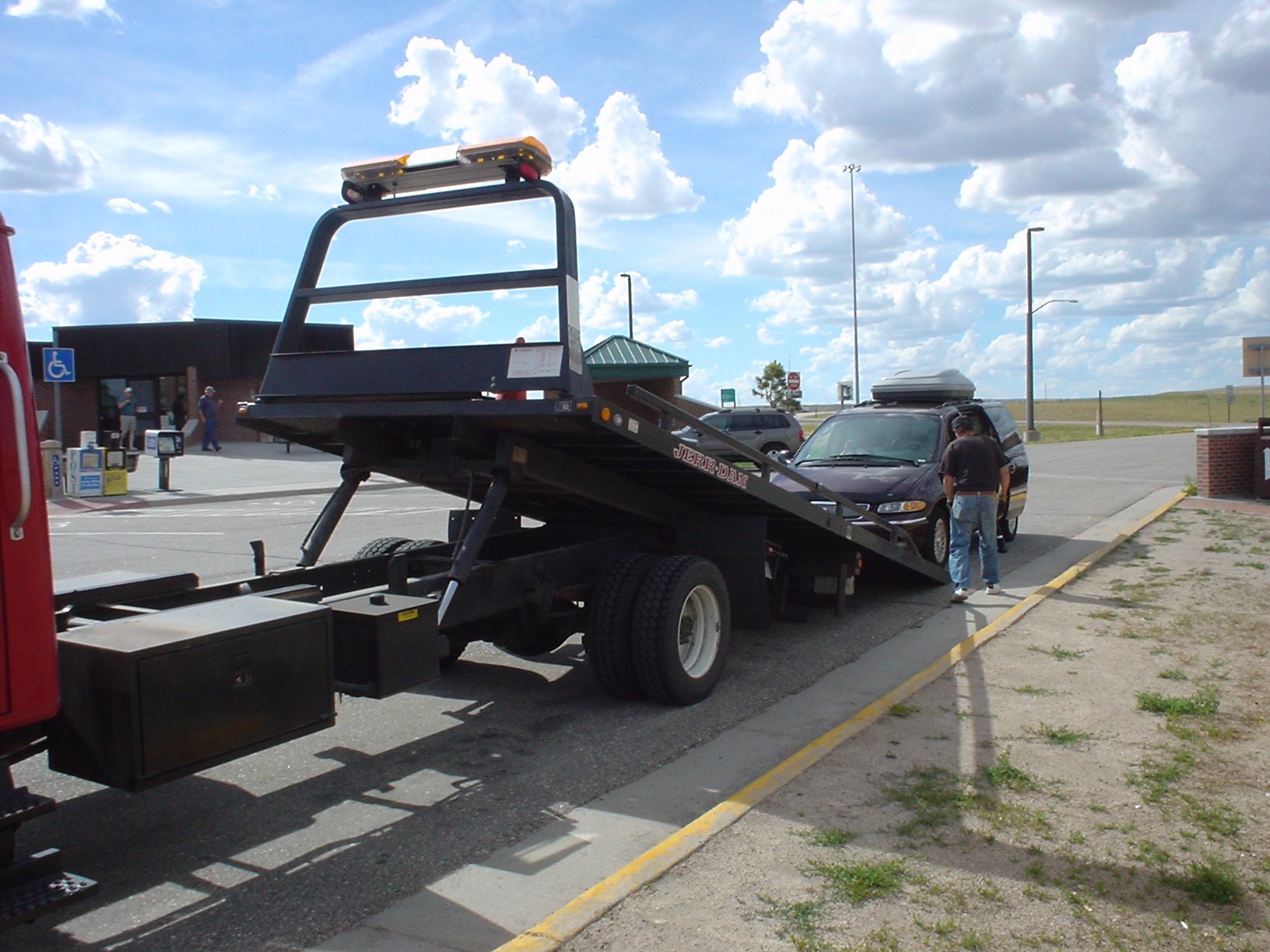 Our vacation objective was to spend July 4th at Mt. Rushmore, where we've heard they put on a fantastic fireworks display. Fortunately, we left several days before July 4th, because about 3 hours enroute to South Dakota, the transmission fluid emptied from our van. Here is the tow truck, taking the van (with us inside) to Douglas, Wyoming, for repairs. |