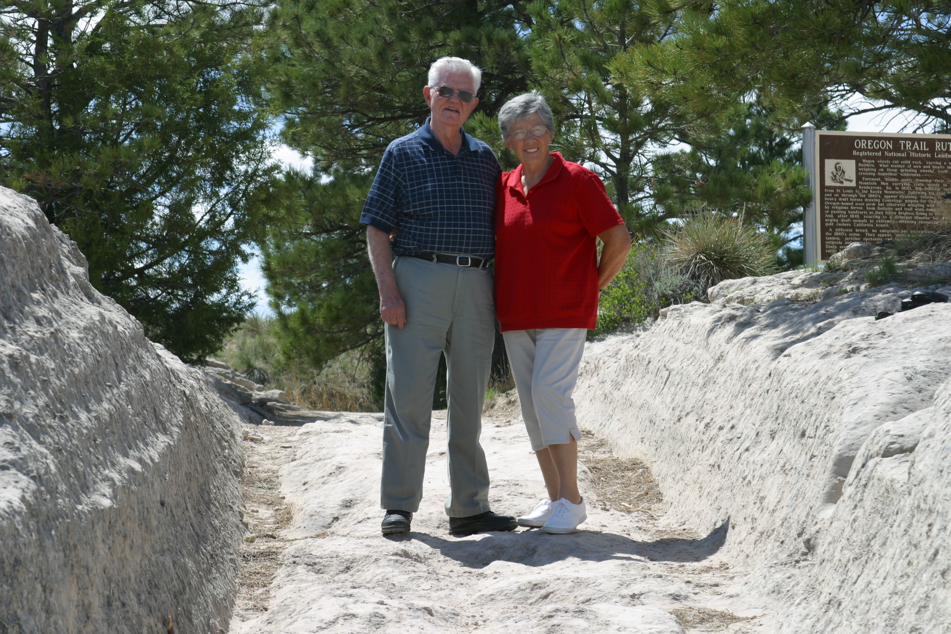 Grandparents in wheel ruts on the Oregon Trail. |