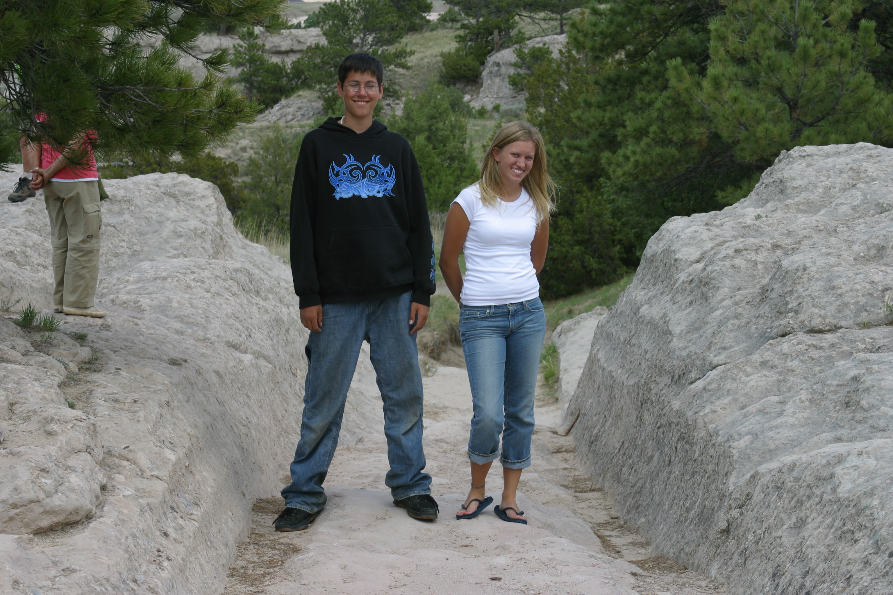 Grandkics in wheel ruts on the Oregon Trail. |