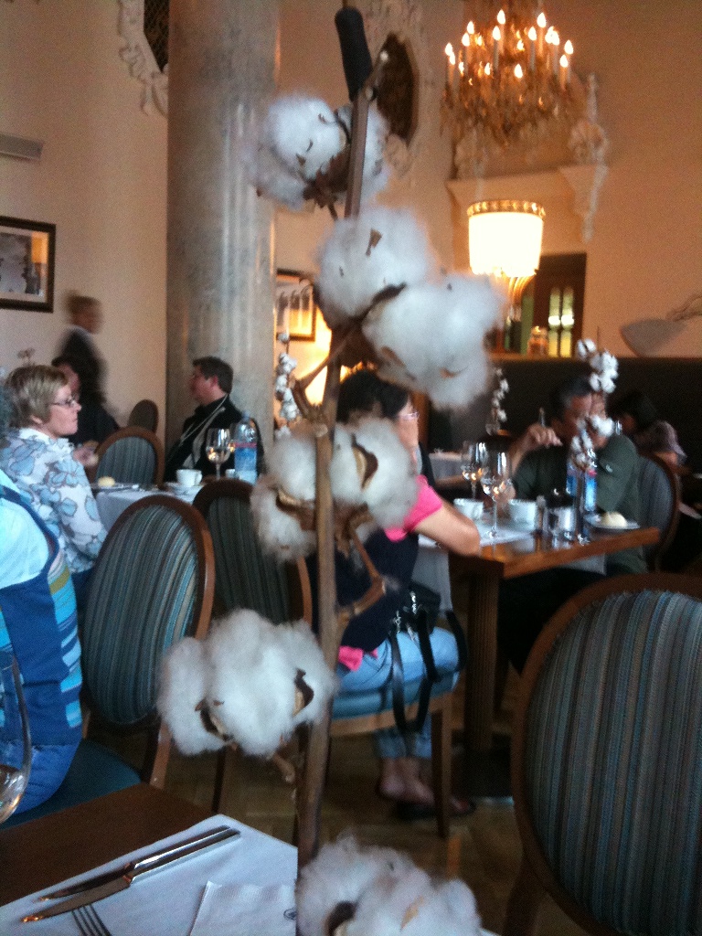 Our dinner this evening was served at the hotel. The table centerpieces were constructed of cotten, something I've never seen before as decoration. The meal was absolute fantastic: grilled salmon, vegetables, etc. |