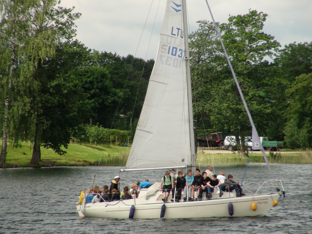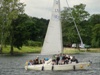 The lake is a recreation and vacation attraction. Today, the weather is very nice, as you can see by this overloaded sailboat. Hard to believe that this lake freezes over during the winter, and they walk or ice skate across it to the castle. |