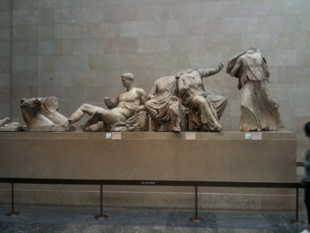 The Rosetta Stone is displayed very differently than it was years ago when we first saw it. Now in a large glass case, to protect it from the visitors, they have a full-size replica in a nearby room that invites touching. Here is a picture of Michael and Sara next to it in 1998,when visitors could stand next to it. |