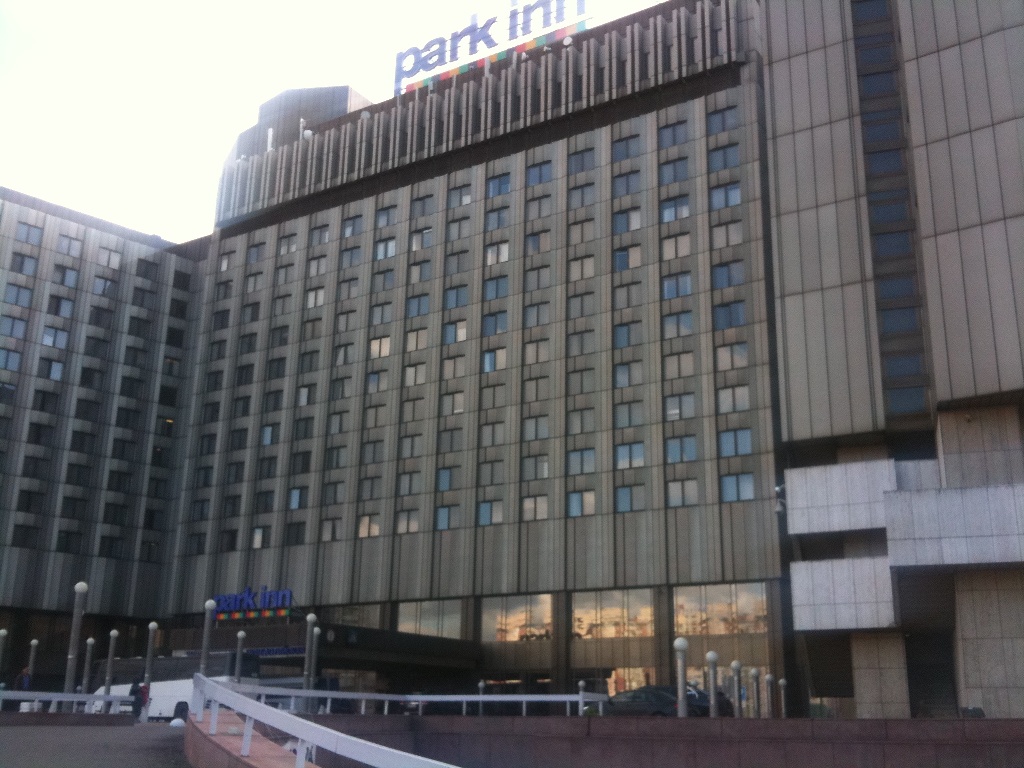 This is our hotel, the Park Inn Pribaltiyskaya (I can pronounce the first two words). The picture does not do it justice, as it appears very new and modern. The dinner this evening was wonderful, surely prepared for visitors with western tastes. |