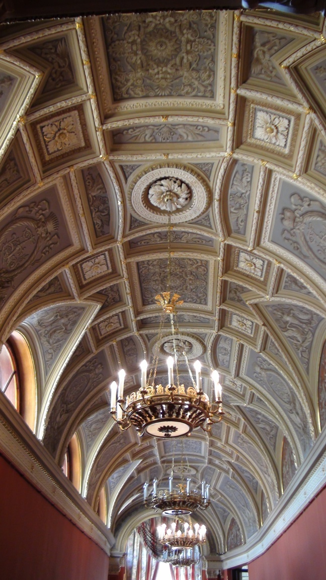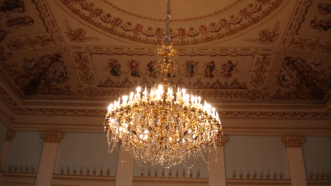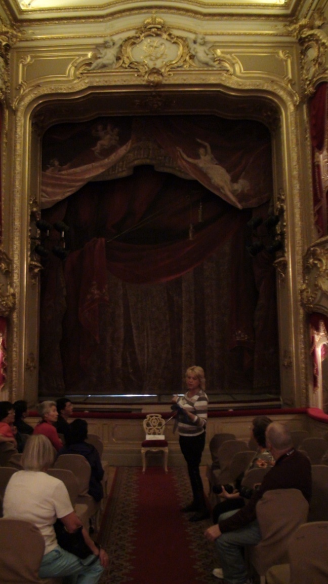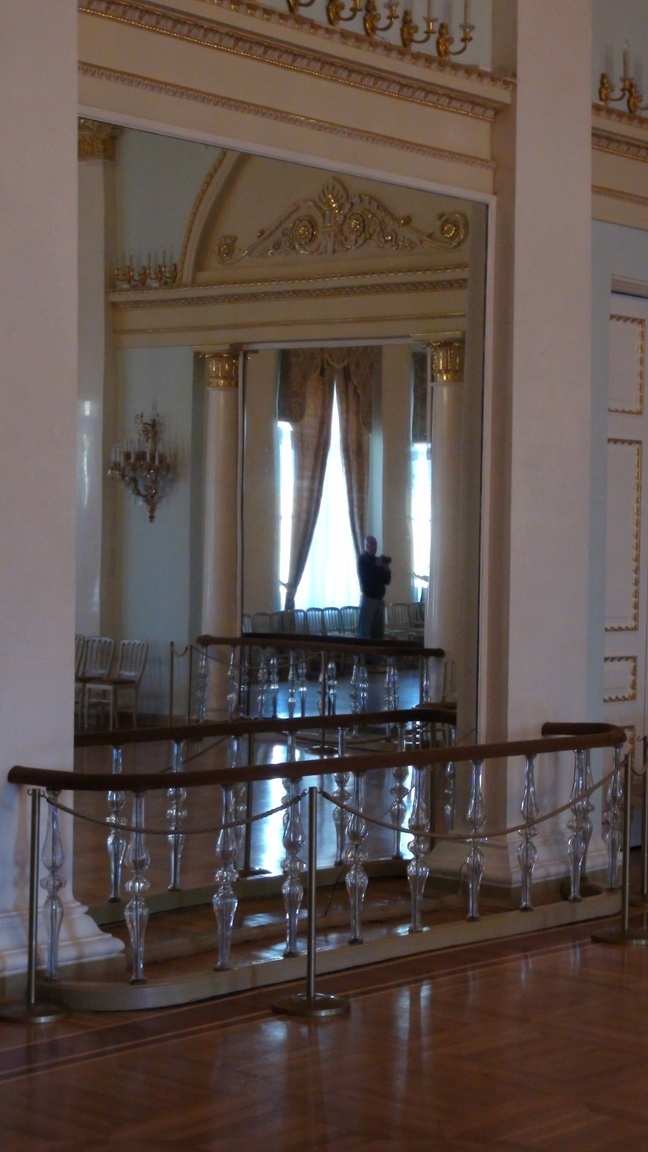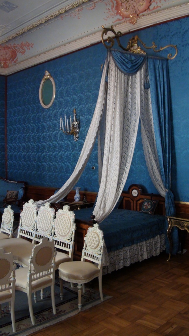 We're now inside the palacial residence of the Yusopov family, descended from and enriched by the activity of the Huns.This place reminds us of Versailles. This is the bed in the blue room. There are many rooms, most with a color theme (red, yellow, green, etc.). |