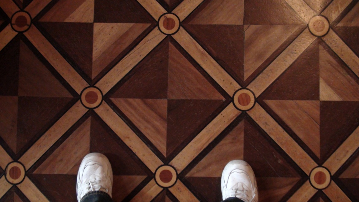 The parquet floor (with my tennis shoes to illustrate size). |