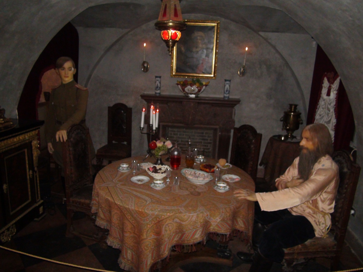 Rasputin is sitting at a table, being poisoned, then beaten, then shot, then thrown in the river. They found water in his lungs, so he was a fairly tough guying, finally dying by drowning. |